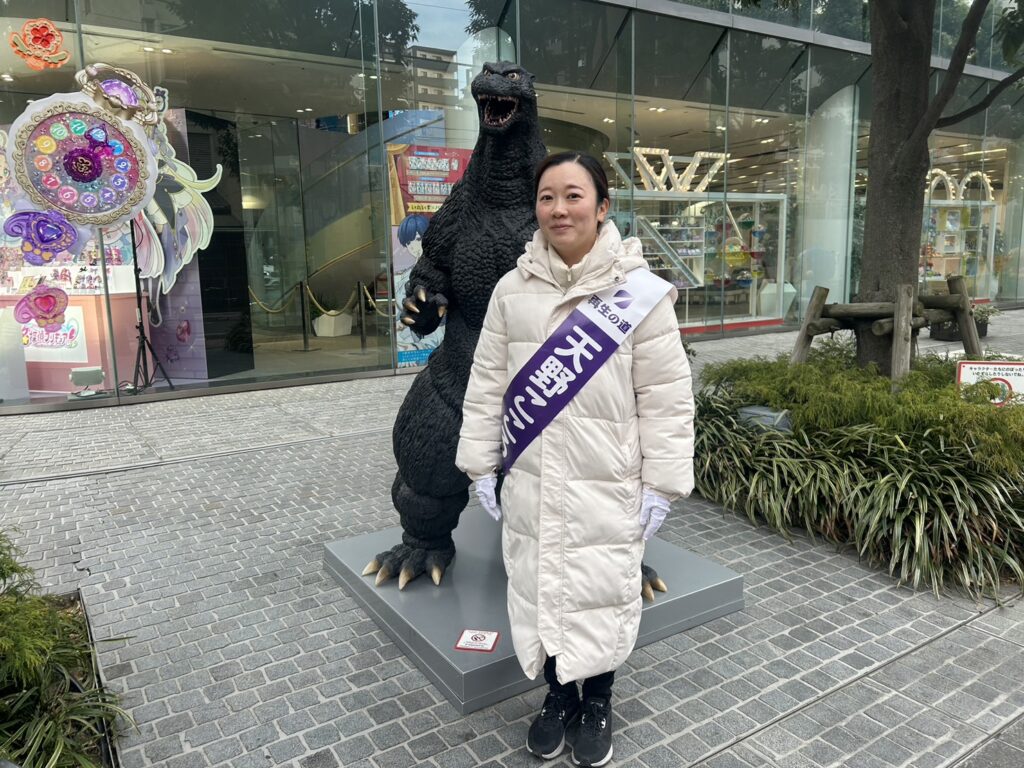 そして、蔵前から浅草・雷門まで練り歩き。途中、バンダイ前でまさかの“ゴジラ”に遭遇!